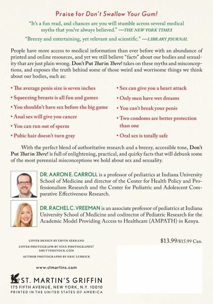 People have more access to medical information than ever before with an abundance of printed and online resources, and yet we still believe "facts" about our bodies and sexuality that are just plain wrong. Don't Put That in There! takes on these myths and misconceptions, and exposes the truth behind some of those weird and worrisome things we think about our bodies, such as: .The average penis size is seven inches .Squeezing breasts is all fun and games .You shouldn't have sex before the big game .Anal sex will give you cancer .Two condoms are better protection than one .Pubic hair doesn't turn gray .Sex can give you a heart attack .Only men have wet dreams .You can't break your penis .You can run out of sperm With the perfect blend of authoritative research and a breezy, accessible tone, Don't Put That in There! is full of enlightening, practical, and quirky facts that will debunk some of the most perennial misconceptions we believe about sex and sexuality.