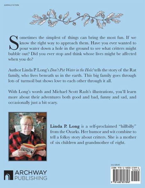 Sometimes the simplest of things can bring the most fun. If we know the right way to approach them. Have you ever wanted to pour water down a hole in the ground to see what critters might bubble out? Did you ever stop and think whose lives might be affected when you do? Author Linda P. Long's Don't Put Water in the Hole! tells the story of the Rat family, who lives beneath us in the earth. This big family goes through lots of turmoil but shows love to each other through it all. With Long's words and Michael Scott Rash's illustrations, you'll learn more about their adventures both good and bad, funny and sad, and occasionally just a bit scary.