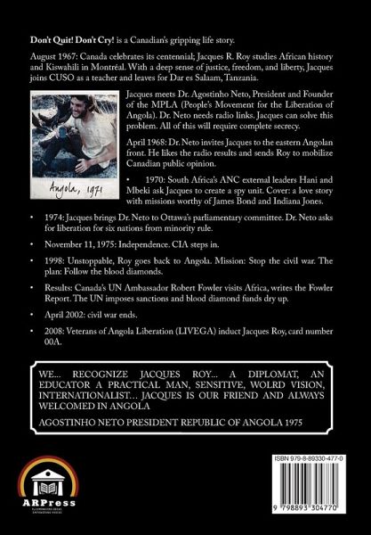 Don't Quit-Don't Cry is a Canadian's gripping life story. August 1967: Canada celebrates its centennial; Jacques R. Roy studies African history and Kiswahili in Montreal. With a deep sense of justice, freedom, and liberty, Jacques joins CUSO as a teacher and leaves for Dares Salaam. Tanzania. Jacques meets Dr. Agostinho Neto, President and Founder of the MPLA (People's Movement for the Liberation of Angola). Dr. Neto needs radio links. Jacques can solve this problem. All of this will require complete secrecy. April 1968: Dr. Neto invites Jacques to the eastern Angolan front. He likes the radio results and sends Roy to mobilize Canadian public opinion. - 1970: South Africa's ANC external leaders Hani and Mbeki ask Jacques to create a spy unit. Cover: a love story with missions worthy of James Bond and Indiana Jones. - 1974: Jacques brings Dr. Neto to Ottawa's parliamentary committee. Dr. Neto asks for liberation for six nations from minority rule". - November 11, 1975: Independence. CIA steps in. - 1998: Unstoppable, Roy goes to Angola. Mission: Stop the civil war. The plan: Follow the blood diamonds. - Results: Canada's UN Ambassador Robert Fowler visits Africa, writes the Fowler Report. The UN imposes sanctions and blood diamond funds dry up. - April 2002: civil war ends. - 2008: Veterans of Angola Liberation (LIVEGA) induct Jacques Roy, card number 00A. We (MPLA) ... recognize Jacques Roy, educator, practical man ... an internationalist, a diplomat ... is welcome at all times in Angola." President Agostinho Neto, 1975.