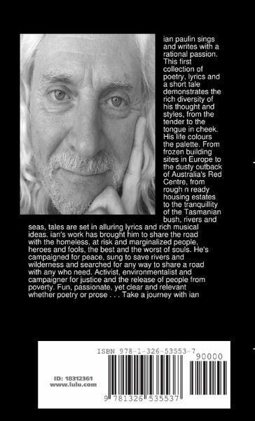 ian paulin sings and writes with a rational passion. This first collection of poetry, lyrics and a short tale demonstrates the rich diversity of his thought and styles, from the tender to the tongue in cheek. His life colours the palette. From frozen building sites in Europe to the dusty outback of Australia's Red Centre, from rough n ready housing estates to the tranquillity of the Tasmanian bush, rivers and seas, tales are set in alluring lyrics and rich musical ideas. ian's work has brought him to share the road with the homeless, at risk and marginalized people, heroes and fools, the best and the worst of souls. He's campaigned for peace, sung to save rivers and wilderness and searched for any way to share a road with any who need. Activist, environmentalist and campaigner for justice and the release of people from poverty. Fun, passionate, yet clear and relevant whether poetry or prose, live performance . . . Take a journey with ian