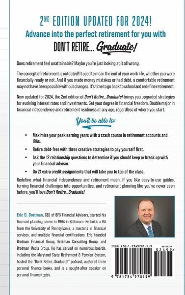 Fully updated 2nd edition! Advance into the perfect retirement for you with Don't Retire...Graduate! Whether retirement is right around the corner or you've just stepped into your professional life, financial independence can feel daunting and unattainable. Stressful money mistakes or debt shouldn't postpone retirement planning until your golden years. The earlier you start, the better - but it's never too late to go back to school and double major in financial independence and retirement readiness at any age! Don't Retire...Graduate! is your degree in fully-fledged financial freedom with a full syllabus of courses that will help you advance, not retreat, into the perfect retirement for you. Now updated for 2024, the 2nd edition of Don't Retire...Graduate! brings you updated strategies for evolving interest rates and investments, including insights on Roth IRAs and an overview of the SECURE Act 2.0. Gain the expertise you need with the assistance of experienced retirement planners. Get answers to powerful financial questions including how to navigate challenges after a global pandemic and legislation impacting personal finance. No matter where you are along your personal finance journey, this guide will meet you there with simple insights for beginners and a step-by-step plan for growing your wealth, your way - so you can graduate into a successful retirement when you're ready! You're about to learn:Three smart investing strategies to free yourself from debt while still paying yourself first. Why risk management and insurance will build security for your financial castle and everyone living in it. The 12 relationship questions to determine if you should keep or break up with your financial advisor, wealth manager, or CFP®. How to maximize the peak earning years of your career with a crash course in retirement accounts and IRAs. Twenty-one extra credit assignments in financial independence to take you to the top of the class. Discover what "retired" means with the financial literacy you've been missing! If you're ready to get your retirement right and turn financial challenges into rich opportunities with retirement planning like you've never seen before, read Don't Retire...Graduate! now!