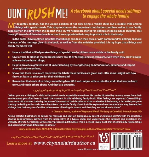 A storybook about special needs siblings to engage the whole family! My daughter, Jordhan, has the unique position of not only being a middle child, but a middle child among siblings with special needs. This story touches on the important contributions Jordhan makes to our family, especially on the days when she doesn’t think so. We need more stories for siblings of special needs children. This is my gift to each of them to show how much we appreciate their very important role in the family. In the book, I have outlined activities that siblings can do on their own, or with parents and/or siblings. To make the most of the message given in the book, as well as from the activities provided, it is my hope that siblings and family members will: Have a tool that will help make siblings of special needs children more visible in the family unit; Give a voice to siblings that represents how real their feelings and concerns are, even when they aren’t always able verbalize those things; Help to provide a greater level of understanding by strengthening communication, patience and respect among family members; Show that there is so much more than the labels these families are given and offer some insight into how they can learn to advocate for their children; and Remember that each of us brings something beautiful and unique with us into the world that we can learn from, and teach others about. And that’s so powerful. "When you are a sibling of a child with special needs, especially one whose life can be dictated by sensory issues from their environment, you often learn to "live in the moment." In this validating family book, Mia's feelings are explored. Often siblings have to sacrifice or alter their day because of the needs of their brother or sister —whether it be leaving a fun activity to go to therapy or dealing with a meltdown that affects the whole family. Don’t Rush Me explores these situations in a way that teaches siblings that their way-too-familiar rollercoaster of feelings is normal and that they are not alone in them." --Diane M. Renna, author of Meghan's World: The Story of One Girl's Triumph Over SPD "Using colorful illustrations to deliver her message and spot-on dialogue, any parent or child can identify with the situations Chynna Laird presents. Written from the perspective of a typical child, one understands the patience and assistance she willingly offers to her siblings with sensory processing difficulties. This is a sweet, lovely book that cheers family relationships and accepts individual differences in others." --Laurie Zelinger, PhD, ABPP, RPT-S, Board Certified Psychologist, author of Please Explain "Terrorism" to Me From Loving Healing Press www.LHPress.com