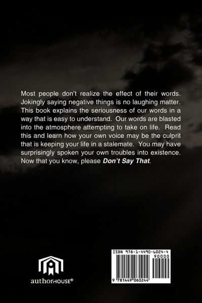 Most people don't realize the effect of their words. Jokingly saying negative things is no laughing matter. This book explains the seriousness of our words in a way that is easy to understand. Our words are blasted into the atmosphere attempting to take on life. Read this and learn how your own voice may be the culprit that is keeping your life in a stalemate. You may have surprisingly spoken your own troubles into existence. Now that you know, please Don't Say That.
