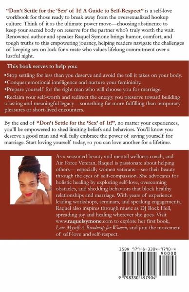 "Don't Settle for the 'Sex' of It! A Guide to Self-Respect" is a self-love workbook for those ready to break away from the oversexualized hookup culture. Think of it as the ultimate power move-choosing abstinence to keep your sacred body on reserve for the partner who's truly worth the wait. Renowned author and speaker Raquel Symone brings humor, comfort, and tough truths to this empowering journey, helping readers navigate the challenges of keeping sex on lock for a mate who values lifelong commitment over a lustful night. This book serves to help you: -Stop settling for less than you deserve and avoid the toll it takes on your body. -Conquer emotional intelligence and nurture your femininity. - Prepare yourself for the right man who will choose you for marriage. - Reclaim your self-worth and redirect the energy you preserve toward building a lasting and meaningful legacy-something far more fulfilling than temporary pleasures or short-lived encounters. By the end of "Don't Settle for the 'Sex' of It!", no matter your experiences, you'll be empowered to shed limiting beliefs and behaviors. You'll know you deserve a good man and will fully embrace the power of saving yourself for marriage. Start loving yourself today, so you can love another for a lifetime.