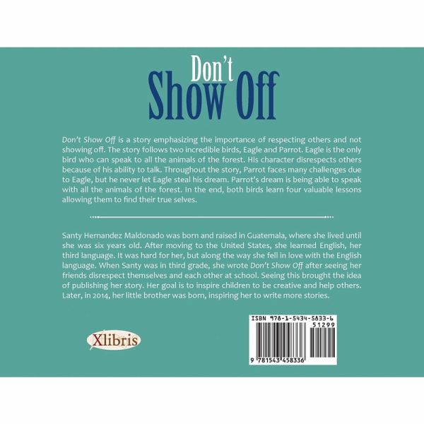 Don't Show Off is a story emphasizing the importance of respecting others and not showing off. The story follows two incredible birds, Eagle and Parrot. Eagle is the only bird who can speak to all the animals of the forest. With his character, he goes on disrespecting others because of his ability to talk. Throughout the story, Parrot faces many challenges due to Eagle, but he never lets Eagle steal his dream. Parrot?s dream is being able to speak with all the animals of the forest. In the end, both birds learn four valuable lessons, allowing them to find their true selves.