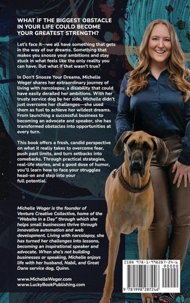 What if your greatest challenges could become your greatest strengths? Well, guess what? They can! You have big dreams... Yet obstacles, fears, and even your own body might be holding you back. It's overwhelming, and it's far less scary to hit the snooze button, roll back over, and carry on living life as you know it... But your fear is what's really holding you back... and you can overcome it! Living with narcolepsy and cataplexy, Michelle Weger knows this struggle all too well-but she turned her toughest experiences into fuel to power her success. Don't Snooze Your Dreams is not only a memoir but also a powerful self-help guide for anyone facing obstacles in life. With humor, heart, and hard-earned wisdom, Weger takes you on her extraordinary journey-from managing a rare debilitating sleep disorder to launching a successful business and becoming an advocate for narcolepsy awareness. But this book isn't just for people with narcolepsy or with a disability. Michelle's insights go far beyond her personal experience. Her lovable Great Dane serves as her medical alert service dog and constant companion, reminding readers that help comes in many forms. Michelle's story is filled with funny and heartwarming moments that will keep you turning the pages, but it's also packed with practical strategies for overcoming your own fears, no matter what challenges you face. Inside this inspirational guide, you'll discover: - Michelle's remarkable journey living with narcolepsy and cataplexy-and how you can find strength in your own struggles, whatever they may be - How to embrace your vulnerabilities and turn them into strengths - The role of humor in facing life's challenges (including a few laughs about life with a giant canine!) - How to identify each part of what's keeping you from achieving your dreams... and how you'll know when it's right to confront your fears and when it's better to work around them - The reason a role model is more powerful than you might realize... and how to find yours - Why your fears are holding you back-and how a Paper Dinosaur can change your perspective - The DREAM Method: 5 simple steps to unlocking your potential and turning your biggest dreams into reality - How to build momentum and take small, powerful steps toward success-even on your hardest days - Why role models and allies are crucial to your success-and how to find and lean on them And much more. Don't Snooze Your Dreams is an unforgettable blend of memoir and self-help, offering readers the inspiration and motivation they need to take control of their lives. Whether you're looking to achieve big dreams or simply overcome the daily challenges life throws at you, this book will show you how to move forward, one step at a time.