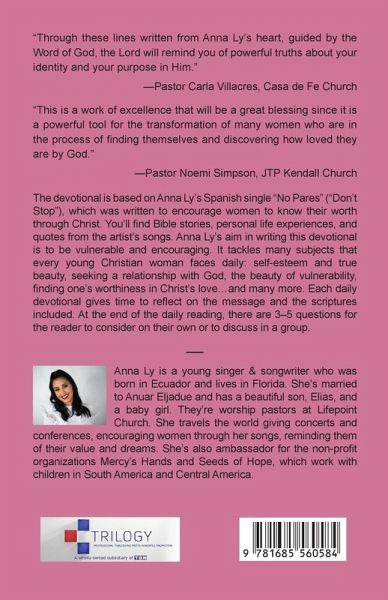 "Through these lines written from Anna Ly's heart, guided by the Word of God, the Lord will remind you of powerful truths about your identity and your purpose in Him." -Pastor Carla Villacres, Casa de Fe Church "This is a work of excellence that will be a great blessing since it is a powerful tool for the transformation of many women who are in the process of finding themselves and discovering how loved they are by God." -Pastor Noemi Simpson, JTP Kendall Church The devotional is based on Anna Ly's Spanish single "No Pares" ("Don't Stop"), which was written to encourage women to know their worth through Christ. You'll find Bible stories, personal life experiences, and quotes from the artist's songs. Anna Ly's aim in writing this devotional is to be vulnerable and encouraging. It tackles many subjects that every young Christian woman faces daily: self-esteem and true beauty, seeking a relationship with God, the beauty of vulnerability, finding one's worthiness in Christ's love...and many more. Each daily devotional gives time to reflect on the message and the scriptures included. At the end of the daily reading, there are 3-5 questions for the reader to consider on their own or to discuss in a group.