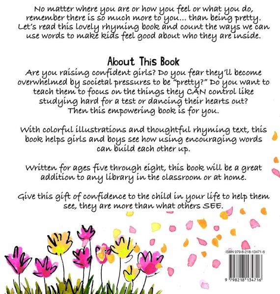 ¿¿Are you raising confident girls? Do you fear they'll become overwhelmed by societal pressures to be "pretty?" Do you want to teach them to focus on the things they CAN control like studying hard for a test or dancing their hearts out? Then this empowering book is for you. With colorful illustrations and thoughtful rhyming text, this book helps girls and boys see how using encouraging words can build each other up. Written for ages five through eight, this book will be a great addition to any library in the classroom or at home. Give this gift of confidence to the child in your life to help them see, they are more than what others SEE.