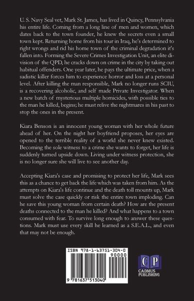 U. S. Navy Seal vet, Mark St. James, has lived in Quincy, Pennsylvania his entire life. Coming from a long line of men and women, which dates back to the town founder, he knew the secrets even a small town kept. Returning home from his tour in Iraq, he's determined to right wrongs and rid his home town of the criminal degradation it's fallen into. Forming the Severe Crimes Investigation Unit, an elite division of the QPD, he cracks down on crime in the city by taking out habitual offenders. One year later, he pays the ultimate price, when a sadistic killer forces him to experience horror and loss at a personal level. After killing the man responsible, Mark no longer runs SCIU, is a recovering alcoholic, and self made Private Investigator. When a new batch of mysterious multiple homicides, with possible ties to the man he killed, begins; he must relive the nightmares in his past to stop the ones in the present. Kiara Benson is an innocent young woman with her whole future ahead of her. On the night her boyfriend proposes, her eyes are opened to the terrible reality of a world she never knew existed. Becoming the sole witness to a crime she wants to forget, her life is suddenly turned upside down. Living under witness protection, she is no longer sure she will live to see another day. Accepting Kiara's case and promising to protect her life, Mark sees this as a chance to get back the life which was taken from him. As the attempts on Kiara's life continue and the death toll mounts up, Mark must solve the case quickly or risk the entire town imploding. Can he save this young woman from certain death? How are the present deaths connected to the man he killed? And what happens to a town consumed with fear. To survive long enough to answer these questions. Mark must use every skill he learned as a S.E.A.L., and even that may not be enough.