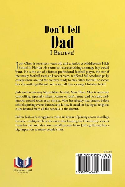Josh Olsen is seventeen years old and a junior at Middletown High School in Florida. He seems to have everything a teenage boy would want. He is the son of a former professional football player, the star of the varsity football team and soccer team, is offered full scholarships by colleges from around the country, ready to play either football or soccer, has a beautiful girlfriend, and above all, has a strong Christian belief. Josh just has one very big problem: his dad, Matt Olsen. Matt is extremely controlling, especially when it comes to Josh's future, and he is also well-known around town as an atheist. Matt has already had prayers before school sporting events banned and is now focused on having all religious clubs banned from all the schools in the district. Follow Josh as he struggles to make his dream of playing soccer in college become a reality while at the same time keeping his Christianity a secret from his dad and also how a small present from Josh's girlfriend has a big impact on so many people's lives.