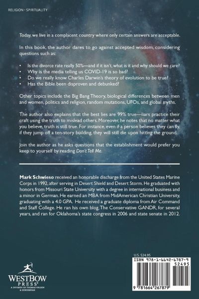 Today, we live in a complacent country where only certain answers are acceptable. In this book, the author dares to go against accepted wisdom, considering questions such as: ¿ Is the divorce rate really 50%-and if it isn't, what is it and why should we care? ¿ Why is the media telling us COVID-19 is so bad? ¿ Do we really know Charles Darwin's theory of evolution to be true? ¿ Has the Bible been disproven and debunked? Other topics include the Big Bang Theory, biological differences between men and women, politics and religion, random mutations, UFOs, and global myths. The author also explains that the best lies are 99% true-liars practice their craft using the truth to mislead others. Moreover, he notes that no matter what you believe, truth is still true. For instance, even if a person believes they can fly, if they jump off a ten-story building, they will still die upon hitting the ground. Join the author as he asks questions that the establishment would prefer you keep to yourself by reading Don't Tell Me.