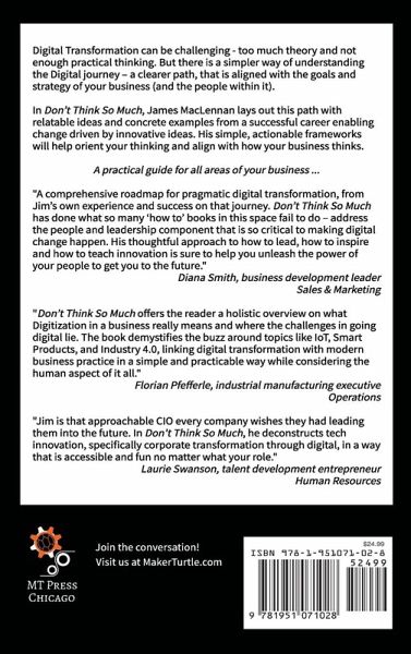 Discussions around Digital Transformation can be challenging - too much theory and not enough practical thinking. Complex ideas, nuanced insights, and waves of techno-speak can confuse and complicate things. You may believe that Digital Thinking will optimize your operations, bring you closer to your customers, create powerful new products, and build a highly engaged team … but where do you start? And how can you effectively lead the change? There is a simpler way of understanding the Digital journey - think of it as more evolutionary than revolutionary. A clearer path, that is aligned with the goals and strategy of your business (and the people within it), will accelerate your Digital plans. In Don't Think So Much, author James MacLennan lays out this path with relatable ideas and concrete examples. Familiar patterns will emerge, and the simple, actionable frameworks described here will help you orient your thinking and align with these patterns. You could argue that the process is already underway. We have witnessed an evolution over the past 30+ years in organizations where basic automation, accounting and manufacturing systems, email and e-commerce, and computer assisted engineering have already made transformative impacts on your operations, your customers, your products, and your employees. But this work often happens in disconnected silos, and is not truly meaningful to the most valuable people in your organization - the ones closest to your customers. This book pulls together data-enabled ideas that have developed over time, and connects with the newest enabling technology, tying it all together into an uncomplicated picture. Don't Think So Much also focuses on the human factors - design, sustainability, and a fully engaged workforce. With practical guidelines for strong leadership and an inclusive approach that leverages the experience of the whole organization, Don't Think So Much will enable a Digital Transformation that delivers results and creates real value.