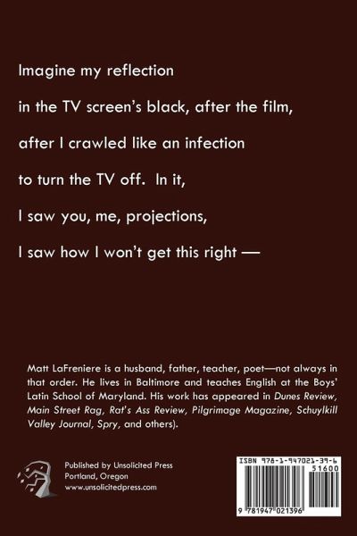 DON’T TURN THE PROJECTOR OFF! by Matthew LaFreniere is a poetry collection that touches on the innermost wonders of humanity. A combination of absurdity and endearment transform everyday images into works of art. Matt sits in his basement and stares at his laptop. He thinks about movies. He thinks about poems. He thinks about anything but you, reader. Then he thinks about you, reader. He sits beneath a poster of the movie The Purple Rose of Cairo. He likes the movie fine, but not as much as the poster. The cat walks past. He hears his wife and kids shuffle above him. He stares at his laptop.