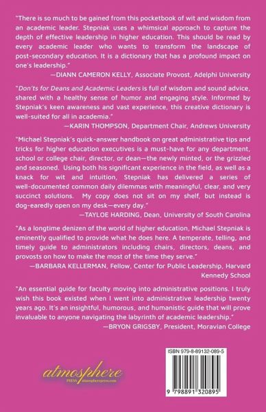"There is so much to be gained from this pocketbook of wit and wisdom from an academic leader. Stepniak uses a whimsical approach to capture the depth of effective leadership in higher education. This should be read by every academic leader who wants to transform the landscape of post-secondary education. It is a dictionary that has a profound impact on one's leadership." -Diann Cameron Kelly, Associate Provost, Adelphi University "Don'ts for Deans and Academic Leaders is full of wisdom and sound advice, shared with a healthy sense of humor and engaging style. Informed by Stepniak's keen awareness and vast experience, this creative dictionary is well-suited for all in academia." -Karin Thompson, Department Chair, Andrews University "Michael Stepniak's quick-answer handbook on great administrative tips and tricks for higher education executives is a must-have for any department, school or college chair, director, or dean-the newly minted, or the grizzled and seasoned. Using both his significant experience in the field, as well as a knack for wit and intuition, Stepniak has delivered a series of well-documented common daily dilemmas with meaningful, clear, and very succinct solutions. My copy does not sit on my shelf, but instead is dog-earedly open on my desk-every day." -Tayloe Harding, Dean, University of South Carolina "As a longtime denizen of the world of higher education, Michael Stepniak is eminently qualified to provide what he does here. A temperate, telling, and timely guide to administrators including chairs, directors, deans, and provosts on how to make the most of the time they serve." -Barbara Kellerman, Fellow, Center for Public Leadership, Harvard Kennedy School "An essential guide for faculty moving into administrative positions. I truly wish this book existed when I went into administrative leadership twenty years ago. It's an insightful, humorous, and humanistic guide that will prove invaluable to anyone navigating the labyrinth of academic leadership." -Bryon Grigsby, President, Moravian College -- Do you want to succeed as a new or developing leader within academia? Are you needing a resource with helpful advice that is both practical and accessible? Start with this playful and illuminating collection of reflections on what not to do when leading among higher education faculty. Written by a seasoned educator and keen student of the human condition, this guidebook provides powerful insights to help you prosper.