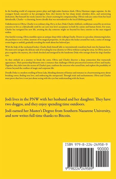 In the bustling world of corporate power plays and high-stakes business deals, Olivia Hartman reigns supreme. As the youngest female executive at her prestigious firm, she's known for her sharp mind, relentless drive, and unwavering dedication. But beneath her steely exterior lies a heart yearning for companionship. Olivia's only joy comes from her loyal labradoodle, Charlie-a charming, brown doodle that was surrendered to the local Edinburg pound. Unbeknownst to Olivia, Charlie is no ordinary dog. He is, in fact, Duke Charles Ashford, a nobleman cursed by an envious sorceress to live as a labradoodle until he can earn true love's acceptance in both his canine and human forms. For years, Charles has navigated his new life, awaiting the day someone might see beyond his furry exterior to the man trapped within. One fateful evening, Olivia stumbles upon an antique shop while walking Charlie. Drawn to a peculiar, shimmering locket, she purchases it on a whim, unaware of its magical properties. As she places the locket around her neck, a series of strange events begin to unfold, gradually revealing the truth about her beloved pet. With the help of the enchanted locket, Charles finds himself able to intermittently transform back into his human form. He must now navigate the delicate task of revealing his true identity to Olivia without scaring her away. As Olivia starts to piece together the mystery, she is both shocked and intrigued by the handsome Duke who emerges from her dog's familiar eyes. As they embark on a journey to break the curse, Olivia and Charles discover a deep connection that transcends appearances. Their partnership blossoms into a romance that challenges Olivia's preconceived notions of love and loyalty. Together, they delve into the secrets of Charles's past, confront the sorceress who cursed him, and explore the possibility of a future beyond the confines of magic and corporate life. Doodle Duke is a modern retelling of Swan Lake, blending elements of fantasy and romance in a heartwarming story about breaking curses, finding true love, and embracing the unexpected. Through trials and enchantments, Olivia and Charles must prove that love is not just about seeing with the eyes but understanding with the heart.