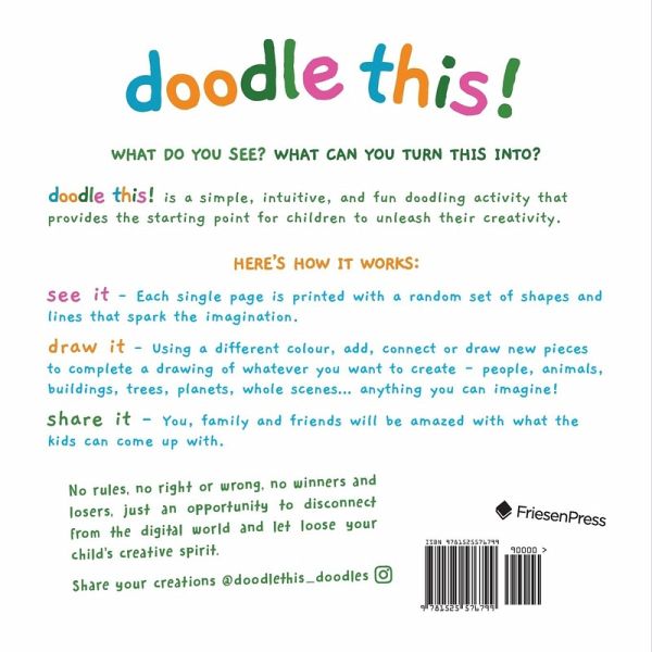 What do you see? What can you turn it into? "doodle this!" is a simple, intuitive, and fun doodling activity that provides the starting point for children to unleash their creativity. Here's how it works: see it - Each single page is printed with a random set of shapes and lines that spark the imagination. draw it - Using a different colour, add, connect or draw new pieces to complete a drawing of whatever you want to create - people, animals, buildings, trees, planets, whole scenes... anything you can imagine! share it - You, family and friends will be amazed with what the kids can come up with. No rules, no right or wrong, no winners and losers, just an opportunity to disconnect from the digital world and let loose your child's creative spirit. Share your creations @doodlethis_doodles