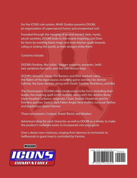 This version is for distribution. Color interior. DOOM for Icons presents an organization of evil sorcerers who worship a dark evil, they use metahumans and demons -- including the dreaded Riders of the Apocalypse -- to fulfill their foul goals. Can your heroes stop them from covering the world in darkness? This book includes details on DOOM and its operatives, includes new powers and gear, adventure ideas, and lots of foes to fight.