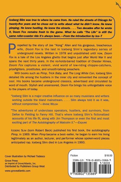 Propelled by the story of Joe "Kong" Allen and his gorgeous, treacherous wife, Doom Fox is the last in Iceberg Slim's legendary series of underground novels. Written in 1978 and unpublished until now, Doom Fox is a tale of the Los Angeles ghetto that begins just after World War II and spans the next thirty years. In the no-holds-barred tradition of Chester Himes, Doom Fox captures a violent, vivid world of low-riding chippie-catchers, prizefighters, prostitutes, and smooth-talking preachers. Iceberg Slim detailed life among the hustlers in the inner city and reinvented the concept of cool. His books became underground classics, advertised and circulated by word of mouth. Stylish and uncensored, Doom Fox brings his unforgettable voice to the players of today.