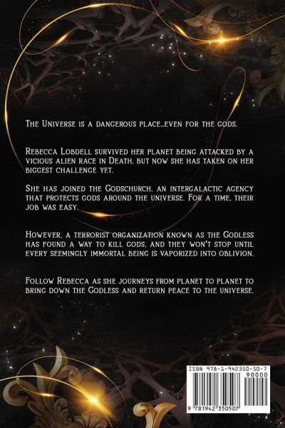 The Universe is a dangerous place...even for the gods. Rebecca Lobdell survived her planet being attacked by a vicious alien race in Death, but now she has taken on her biggest challenge yet. She has joined the Godschurch, an intergalactic agency that protects gods around the universe. For a time, their job was easy. However, a terrorist organization known as the Godless has found a way to kill gods, and they won't stop until every seemingly immortal being is vaporized into oblivion. Follow Rebecca as she journeys from planet to planet to bring down the Godless and return peace to the universe.