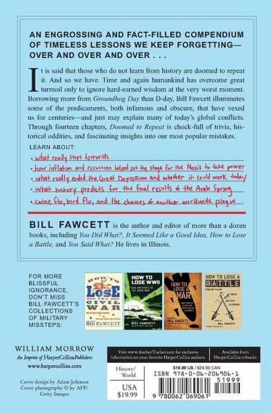 An engrossing and fact-filled compendium of timeless lessons we keep forgetting?over and over and over . . . It is said that those who do not learn from history are doomed to repeat it. And so we have. Time and again humankind has overcome great turmoil only to ignore hard-earned wisdom at the very worst moment. Borrowing more from Groundhog Day than D-day, Bill Fawcett illuminates some of the predicaments, both infamous and obscure, that have vexed us for centuries?and just may explain many of today's global conflicts. Through fourteen chapters, Doomed to Repeat is chock-full of trivia, historical oddities, and fascinating insights into our most popular mistakes. Learn about: * What really stops terrorists * How inflation and recession helped set the stage for the Nazis to take power * What really ended the Great Depression and whether it could work today * What history predicts for the final results of the Arab Spring * Swine flu, bird flu, and the chances of another worldwide plague