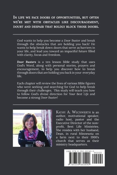 Door Busters is a ten lesson Bible study that uses God's Word, along with personal stories, prayers, and encouragement, to help you discover how to break through doors that are holding you back in your everyday life. Each chapter will review the lives of various Bible figures who were seeking and searching for God to help break through their challenges. This study will teach you how to follow God's divine direction for Your Best Life and become a strong Door Buster!