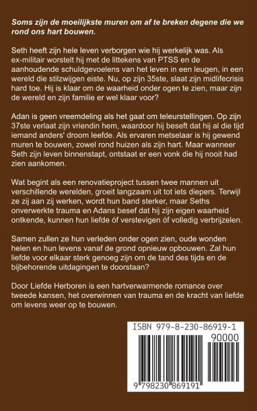 Soms zijn de moeilijkste muren om af te breken degene die we rond ons hart bouwen. Seth heeft zijn hele leven verborgen wie hij werkelijk was. Als ex-militair worstelt hij met de littekens van PTSS en de aanhoudende schuldgevoelens van het leven in een leugen, in een wereld die stilzwijgen eiste. Nu, op zijn 35ste, slaat zijn midlifecrisis hard toe. Hij is klaar om de waarheid onder ogen te zien, maar zijn de wereld en zijn familie er wel klaar voor? Adan is geen vreemdeling als het gaat om teleurstellingen. Op zijn 37ste verlaat zijn vriendin hem, waardoor hij beseft dat hij al die tijd iemand anders' droom leefde. Als ervaren metselaar is hij gewend muren te bouwen, zowel rond huizen als zijn hart. Maar wanneer Seth zijn leven binnenstapt, ontstaat er een vonk die hij nooit had zien aankomen. Wat begint als een renovatieproject tussen twee mannen uit verschillende werelden, groeit langzaam uit tot iets diepers. Terwijl ze zij aan zij werken, wordt hun band sterker, maar Seths onverwerkte trauma en Adans besef dat hij zijn eigen waarheid ontkende, kunnen hun liefde óf verstevigen óf volledig verbrijzelen. Samen zullen ze hun verleden onder ogen zien, oude wonden helen en hun levens vanaf de grond opnieuw opbouwen. Zal hun liefde voor elkaar sterk genoeg zijn om de tand des tijds en de bijbehorende uitdagingen te doorstaan? Door Liefde Herboren is een hartverwarmende romance over tweede kansen, het overwinnen van trauma en de kracht van liefde om levens weer op te bouwen.