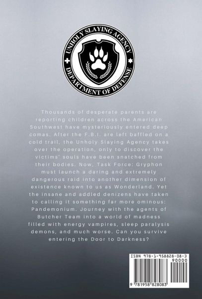 Thousands of desperate parents are reporting children across the American Southwest have mysteriously entered deep comas. After the F.B.I. are left baffled on a cold trail, the Unholy Slaying Agency takes over the operation, only to discover the victims' souls have been snatched from their bodies. Now, Task Force: Gryphon must launch a daring and extremely dangerous raid into another dimension of existence known to us as Wonderland. Yet the insane and addled denizens have taken to calling it something far more ominous: Pandemonium. Journey with the agents of Butcher Team into a world of madness filled with energy vampires, sleep paralysis demons, and much worse. Can you survive entering the Door to Darkness? Survival is not guaranteed, and neither is your sanity. Welcome to the depths of shadow and madness. In the third installment of the USA Series, Guy Quintero takes you on a horrific adventure that transcends dimensions, with a psychedelic, spiritual journey into realms that may seem familiar at first. Get ready for your next mission against a foe that is literally the stuff of nightmares. Follow anti-hero Agent Gabriel Agapito and his team as they try to unravel the mystery and neutralize an evil that threatens slumbering innocent souls. Trigger warning: this novel contains graphic violence and adult language.