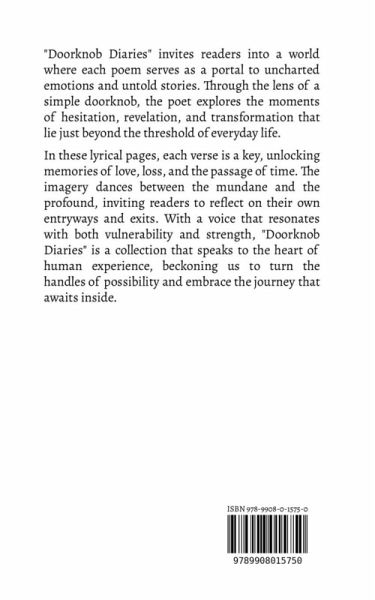 "Doorknob Diaries" invites readers into a world where each poem serves as a portal to uncharted emotions and untold stories. Through the lens of a simple doorknob, the poet explores the moments of hesitation, revelation, and transformation that lie just beyond the threshold of everyday life. In these lyrical pages, each verse is a key, unlocking memories of love, loss, and the passage of time. The imagery dances between the mundane and the profound, inviting readers to reflect on their own entryways and exits. With a voice that resonates with both vulnerability and strength, "Doorknob Diaries" is a collection that speaks to the heart of human experience, beckoning us to turn the handles of possibility and embrace the journey that awaits inside.