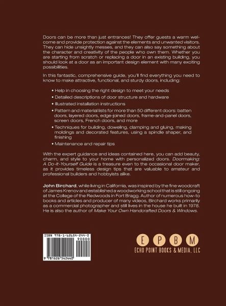 Doors can be more than just entrances! They offer guests a warm welcome and provide protection against the elements and unwanted visitors. They can hide unsightly messes, and they can also say something about the character and creativity of the people who own them. Whether you are starting from scratch or replacing a door in an existing building, you should look at a door as an important design element with many exciting possibilities. In this fantastic, comprehensive guide, you'll find everything you need to know to make attractive, functional, and sturdy doors, including: Help in choosing the right design to meet your needs Illustrated installation instructions Pattern and material lists for more than 50 different doors: batten doors, layered doors, edge-joined doors, frame-and-panel doors, screen doors, French doors, and more Techniques for building, doweling, clamping and gluing, making moldings and decorated features, using a spindle shaper, and finishing Maintenance and repair tips With the expert guidance and ideas contained here, you can add beauty, charm, and style to your home with personalized doors. Doormaking: A Do-It-Yourself Guide is a treasure even to the occasional door maker, as it provides timeless design tips that are valuable to amateur and professional builders and hobbyists alike. John Birchard, while living in California, was inspired by the fine woodcraft of James Krenov and established a woodworking school that is still ongoing at the College of the Redwoods in Fort Bragg. Author of numerous how-to books and articles and producer of many videos, Birchard works primarily as a commercial photographer and still lives in the house he built in 1978. He is also the author of Make Your Own Handcrafted Doors & Windows. Readers interested in related titles from John Birchard will also want to see: Make Your Own Handcrafted Doors & Windows (ISBN: 1626548781).