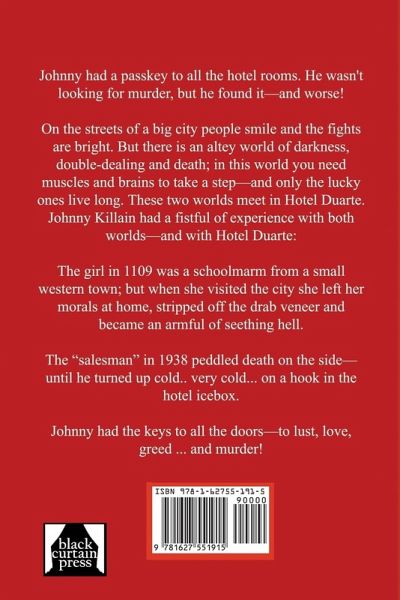 Johnny had a passkey to all the hotel rooms. He wasn't looking for murder, but he found it-and worse! On the streets of a big city people smile and the fights are bright. But there is an altey world of darkness, double-dealing and death; in this world you need muscles and brains to take a step-and only the lucky ones live long. These two worlds meet in Hotel Duarte. Johnny Killain had a fistful of experience with both worlds-and with Hotel Duarte: The girl in 1109 was a schoolmarm from a small western town; but when she visited the city she left her morals at home, stripped off the drab veneer and became an armful of seething hell. The "salesman" in 1938 peddled death on the side-until he turned up cold.. very cold... on a hook in the hotel icebox. Johnny had the keys to all the doors-to lust, love, greed...and murder!