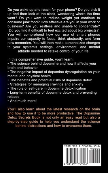 Do you wake up and reach for your phone? Do you pick it up and then look at the clock, wondering where the time went? Do you want to reduce weight yet continue to consume junk food? How effective are you in your work or business? Are you restless and unable to concentrate? Do you find it difficult to feel excited about big projects? You will comprehend how our use of smart phones impairs our capacity to focus, think abstractly, and form new memories. You will then make personalized changes to your system's settings, environment, and mental attitude needed to retake control of your life. In this comprehensive guide, you'll learn:The science behind dopamine and how it affects your brain and behavior The negative impact of dopamine dysregulation on your mental and physical health The benefits and potential risks of dopamine detox Strategies for managing cravings and anxiety The role of self-care in dopamine detoxification Long-term benefits of dopamine detox and preventing relapse And much more! You'll also learn about the latest research on the brain and how to use it to be more productive. The Dopamine Detox Secrets Book is not only an easy read but also a step-by-step guide to help you understand the science behind distractions and how to overcome them.