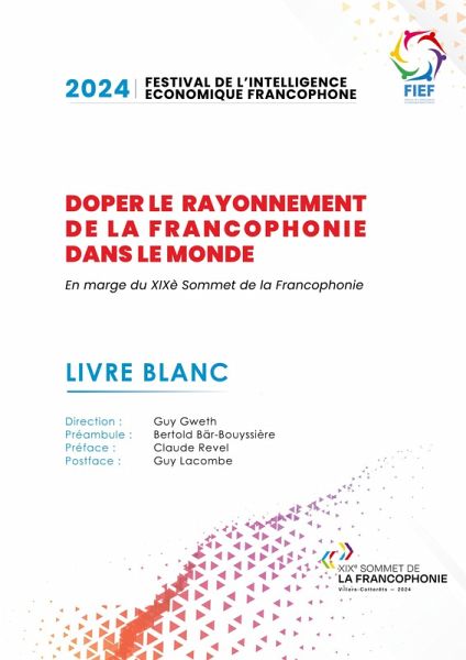 Ce Livre blanc rassemble les travaux de la troisième édition du Festival de l'intelligence économique francophone (FIEF) organisée le 3 octobre 2024, par le Centre africain de veille et d'intelligence économique (CAVIE) en marge du XIXème Sommet de la Francophonie. Les auteurs analysent les causes, conséquences et responsabilités des déficits identifiés et proposent des idées d'amélioration pour accroitre l'influence de l'espace francophone dans le monde. L'ouvrage est prioritairement destiné aux délégations gouvernementales réunies au Sommet des chefs d'Etat et de gouvernement de la Francophonie, aux élus et chefs d'entreprises, aux chercheurs et aux médias intéressés par l'intelligence collective francophone.
