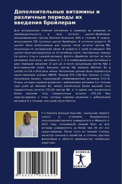 Dlq issledowaniq wliqniq witaminow i periodow ih wwedeniq na proizwoditel'nost' i titr antitel cyplqt-brojlerow, wakcinirowannyh protiw bolezni N'ükasla (BN) w techenie 8 nedel', ispol'zowali 330 sutochnyh cyplqt-brojlerow. V sutochnom wozraste 30 cyplqt byli ispol'zowany dlq ocenki titra antitel protiw ND, poluchennyh po materinskoj linii. V wozraste 2 dnej ostawshiesq 300 cyplqt byli raspredeleny na 10 lechebnyh grupp, powtorennyh trizhdy (po desqt' ptic w kazhdoj replike). Desqt' obrabotok sostoqt iz pqti witaminow (kontrol', witaminy A, S, E i kombinirowannye witaminy) i dwuh periodow wwedeniq (3 dnq do i posle wakcinacii protiw ND) w faktorial'noj sheme. Vakciny protiw ND wwodili (Hitchner B1 i Lasota) na 5-j i 24-j den' zhizni. Poluchennye dannye byli podwergnuty odnostoronnemu analizu ANOVA. Luchshij FCR 2,89 byl poluchen u ptic, poluchawshih racion, soderzhaschij kombinirowannye witaminy A+C+E. Pticy, kotoryh kormili racionom s dobawleniem witamina A w techenie treh dnej do Hichnera B1, imeli znachitel'no bolee wysokij titr syworotochnyh antitel (75,20) protiw ND, w to wremq kak znachitel'no bolee wysokij titr syworotochnyh antitel (741,33) byl zaregistrirowan u ptic, kotoryh kormili racionom s dobawleniem witamina E w techenie treh dnej posle Lasoty.