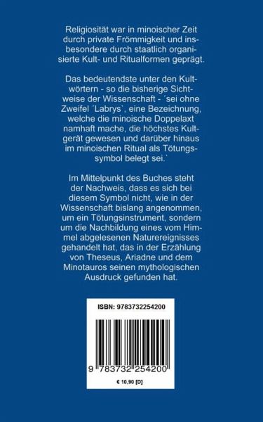 Als hell aufleuchtender Planet hat die Venus neben dem Mond bereits in der Antike die Aufmerksamkeit der Beobachter auf sich gezogen, wobei ihre Größe, verglichen mit der Erscheinungsform des Mondes, einen naturgemäßen Ausdruck in dem nahe liegenden Bild von Vater und Tochter fand.Der Autor konnte ermitteln, dass das frühe minoische Religionskonzept vornehmlich auf die kultische Verehrung der mit den Himmelskörpern identifizierten Gottheiten ausgerichtet war und dass es sich bei dem sagenhaften König Minos und seiner Tochter Ariadne, deren Namensentlehnungen bereits einen astralen Hintergrund besitzen und dem alten Orient entstammen, um Personifikationen von Mond und Venus gehandelt hat. Er weist in diesem Zusammenhang nach, dass die sogenannte minoische Doppelaxt nicht, wie bisher von der Forschung angenommen, ein Tötungsinstrument im Kult, sondern ein für den kultischen Gebrauch notwendiges Ritualsymbol gewesen ist, welches dem Naturschauspiel einer Sonnenfinsternis nachgeformtwar. Im Mittelpunkt dieses Kultes stand die minoische Göttin Ariadne (Aphrodite, Venus), deren Beistand bei der Überwindung nur in der Vorstellung existierender negativer Auswirkungen einer solchen Finsternis auf das Gemeinwesen erbeten wurde. Der Beitrag der Göttin wird in der griechischen Erzählung von Minos, Ariadne, Theseus und dem Minotauros, die dem minoischen Ritual nachgebildet ist, in mythischer Form aufgegriffen und glorifiziert.