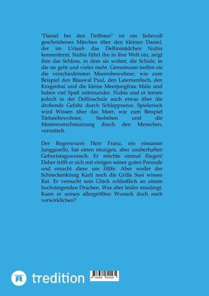 Im ersten Teil meines Doppelbandes geht es um die Freundschaft zwischen einem kleinen Buben und einem Delfin, der Prinzessin Nubia. Diese zeigt ihm ihre Unterwasserwelt und lädt ihn zum Geburtstagsfest ihres Vaters, König Hademar ins Schloss ein. Dort werden die feinsten Delikatessen serviert. Sie nimmt ihn auch mit in ihre Schulklasse, wo die Meerestiere alles über die Gefahren der Tiefsee wie zum Beispiel die Schleppnetze lernen. Sie treffen den riesigen Blauwal Paul, eine Muschel mit einer Perle in ihrem Inneren und Malu, die kleine Meerjungfrau.Im zweiten Teil geht es um unerfüllte Geburtstagswünsche. Herr Franz, ein Junggeselle ist aufgeregt. Sein Geburtstag steht bevor. Seit seiner Kindheit hat er einen riesengroßen Wunsch, der sich aber für ihn leider nie erfüllt hat. Auch seine Nachbarn halten sein Vorhaben für undurchführbar. Er bittet nun seine Freunde um Hilfe und zu guter Letzt hat der Herr Admiral eine wunderbare Idee. Wird es eine schöne Feier? Darf man Wünsche haben, die scheinbar unerfüllbar sind? Soll man trotzdem sein Möglichstes versuchen? Herr Franz wagt es.