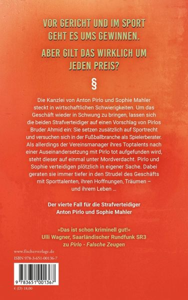 Die Kanzlei von Anton Pirlo und Sophie Mahler steckt in wirtschaftlichen Schwierigkeiten. Um das Geschäft wieder in Schwung zu bringen, lassen sich die beiden Strafverteidiger auf einen Vorschlag von Pirlos Bruder Ahmid ein: Sie setzen zusätzlich auf Sportrecht und versuchen sich in der Fußballbranche als Spielerberater. Als allerdings der Vereinsmanager ihres Toptalents nach einer Auseinandersetzung mit Pirlo tot aufgefunden wird, steht dieser auf einmal unter Mordverdacht. Pirlo und Sophie verteidigen plötzlich in eigener Sache. Dabei geraten sie immer tiefer in den Strudel des Geschäfts mit Fußballtalenten, ihren Hoffnungen, Träumen - und ihrem Leben ...