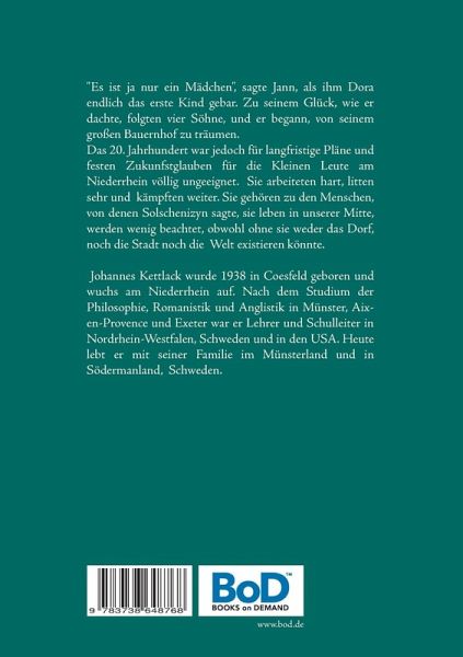 "Es ist ja nur ein Mädchen", sagte Jann, als ihm Dora endlich das erste Kind gebar. Zu seinem Glück, wie er dachte, folgten vier Söhne, und er begann, von seinem großen Bauernhof zu träumen. Das 20. Jahrhundert war jedoch für langfristige Pläne und festen Zukunftsglauben auch für die Kleinen Leute am Niederrhein völlig ungeeignet. Sie arbeiteten hart, litten geduldig und gehörten dennoch zu den Verlierern. Solschenizyn sagte von solchen Menschen, sie leben unter uns und wir merken nicht, dass ohne sie kein Dorf, keine Stadt, ja die Welt nicht existieren könnte.