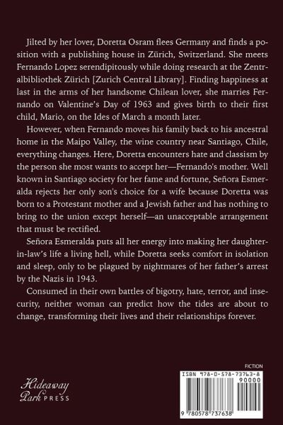 Jilted by her lover, Doretta Osram flees Germany and finds a position with a publishing house in Zürich, Switzerland. She meets Fernando Lopez serendipitously while doing research at the Zentralbibliothek Zürich (Zurich Central Library). Finding happiness at last in the arms of her handsome Chilean lover, she marries Fernando on Valentine's Day of 1963 and gives birth to their first child, Mario, on the Ides of March a month later. However, when Fernando moves his family back to his ancestral home in the Maipo Valley, the wine country near Santiago, Chile, everything changes. Here, Doretta encounters hate and classism by the person she most wants to accept her --Fernando's mother. Well known in Santiago society for her fame and fortune, Señora Esmeralda rejects her only son's choice for a wife because Doretta was born to a Protestant mother and a Jewish father and has nothing to bring to the union except herself -- an unacceptable arrangement that must be rectified. Señora Esmeralda puts all her energy into making her daughter-in-law's life a living hell, while Doretta seeks comfort in isolation and sleep, only to be plagued by nightmares of her father's arrest by the Nazis in 1943. Consumed in their own battles of bigotry, hate, terror, and insecurity, neither woman can predict how the tides are about to change, transforming their lives and their relationships forever.