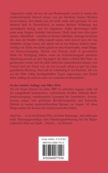 "Eigentlich wollte ich nur für ein Wochenende zurück in meine alte niedersächsische Heimat reisen, um der Hochzeit meines Bruders beizuwohnen. Seit Jahren war ich nicht mehr dort gewesen. Es war brütend heiß in Deutschland, in meiner Berliner Wohnung fast unerträglich stickig, und der nagelneue Alpha Sportwagen sollte seine erste längere Ausfahrt bekommen. Doch dann kam alles ganz anders. Allmählich - zunächst in kleinen Schritten. Anfangs bemerkte ich, dass die Straßen völlig kaputt waren, bald darauf kam mir das Verhalten einiger Leute, mit denen ich zu tun bekam, äußerst merkwürdig vor. Doch wer denkt gleich an eine Katastrophe, wenn Dinge, wie Stromversorgung, Telefon und Internet nicht in gewohntem Maße zur Verfügung stehen, wenn die Sicherheitsorgane paradoxe Handlungsweisen an den Tag legen? Als dann wirklich Blut floss, als geschossen wurde und ich nicht mehr klar unterscheiden konnte, wer Freund und wer Feind war, da war es auch schon zu spät für einen geordneten Rückzug. Nun saß ich wahrhaftig in der Klemme. Ich war auf die Hilfe völlig durchgedrehter Typen angewiesen und immer tiefer verfing ich mich in einer Art surrealen Endlosschleife."