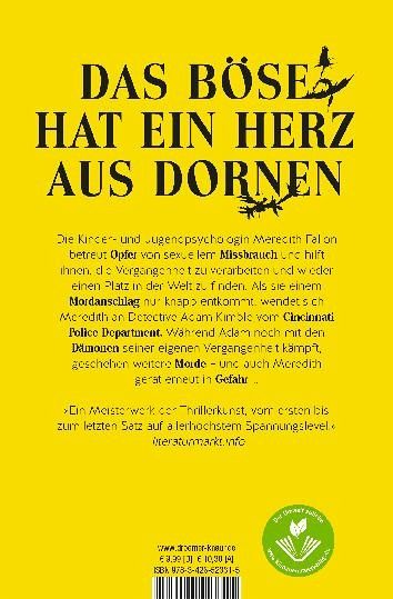 Nach „Dornenmädchen“, „Dornenkleid“ und „Dornenspiel“ fesselt uns Karen Rose mit Band 4 der Dornenserie. Im Mittelpunkt der Handlung stehen die Kinder- und Jugendpsychologin Meredith Fallon und der Mordermittler Detective Adam Kimble, die uns bereits in früheren Büchern begegnet sind. Wir treffen weitere alte Bekannte aus Cincinnati: Detective Scarlett Bishop, Dr. Dani Novak und FBI-Agent Deacon Novak – außerdem stellt uns Karen Rose neue Charaktere vor, die in Nebenrollen glänzen.Bei einem Abendessen mit einer ehemaligen Patientin blickt Meredith Fallon plötzlich in den Lauf einer Pistole. Doch bevor der junge Mann, der Meredith bedroht, sie verletzen kann, wird er aus dem Hinterhalt erschossen. Der Killer flüchtet – und startet damit ein nervenaufreibendes Katz-und-Maus-Spiel zwischen ihm, Meredith und Adam.