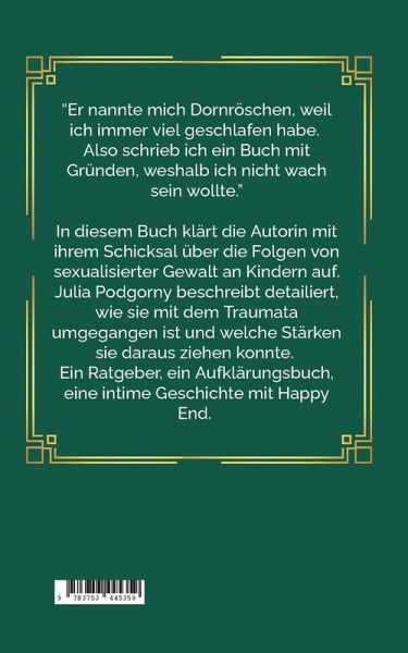 - Er nannte mich Dornröschen, weil ich immer viel geschlafen habe. Also schrieb ich ein Buch mit Gründen, weshalb ich nicht wach sein wollte. - In diesem Buch klärt die Autorin mit ihrem Schicksal über die Folgen von sexualisierter Gewalt an Kindern auf. Julia Podgorny beschreibt detailliert, wie sie mit dem Traumata umgegangen ist und welche Stärken sie daraus ziehen konnte. Ein Ratgeber, ein Aufklärungsbuch, eine intime Geschichte mit Happy End.