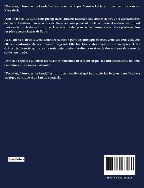 "Dorothée, Danseuse de Corde" est un roman écrit par Maurice Leblanc, un écrivain français du XIXe siècle. Dans ce roman, Leblanc nous plonge dans l'univers fascinant des artistes de cirque et des danseuses de corde. L'histoire tourne autour de Dorothée, une jeune artiste talentueuse et audacieuse, qui est passionnée par la danse sur corde. Elle travaille dur pour perfectionner son art et se produire dans les plus grands cirques de Paris. Au fil du récit, nous suivons Dorothée dans son parcours artistique et découvrons les défis auxquels elle est confrontée dans ce monde exigeant. Elle fait face à des rivalités, des intrigues et des difficultés financières, mais elle reste déterminée à réaliser son rêve de devenir une danseuse de corde renommée. Le roman explore également les relations humaines au sein du cirque, les amitiés sincères, les liens familiaux et les amours naissants. "Dorothée, Danseuse de Corde" est un roman captivant qui transporte les lecteurs dans l'univers magique du cirque et de l'art du spectacle.