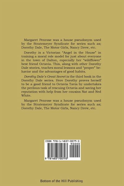 Margaret Penrose was a house pseudonym used by the Stratemeyer Syndicate for series such as; Dorothy Dale, The Motor Girls, Nancy Drew, etc. Dorothy is a Victorian "Angel in the House" in training a moral role model for just about everyone in the town of Dalton, especially her "wildflower" best friend Octavia. This, along with other Dorothy Dale stories, teaches moral lessons and "proper" behavior and the advantages of good habits. Dorothy Dale's Great Secret is the third book in the Dorothy Dale series. Here Dorothy proves herself to be a good friend to Octavia Tavia by undertakes the perilous task of rescuing Octavia and saving her reputation with help from her cousins Nat and Ned White. Margaret Penrose was a house pseudonym used by the Stratemeyer Syndicate for series such as; Dorothy Dale, The Motor Girls, Nancy Drew, etc.