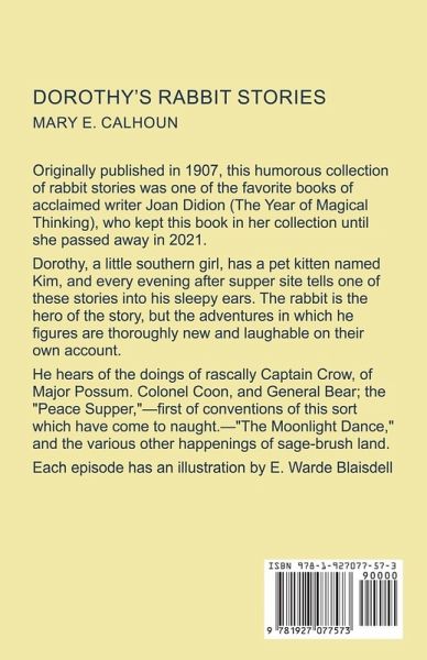Originally published in 1907, this rascally collection of Rabbit stories was one of the favorite books of acclaimed writer Joan Didion (The Year of Magical Thinking), who kept this book in her collection throughout her life.. Dorothy, a little southern girl, has a pet kitten named Kim, and every evening after supper site tells one of these stories into his sleepy ears. The rabbit is the hero of the story, but the adventures in which he figures are thoroughly new and laughable on their own account. He hears of the doings of rascally Captain Crow, of Major Possum. Colonel Coon, and General Bear; the "Peace Supper,"-first of conventions of this sort which have come to naught.-"The Moonlight Dance," and the various other happenings of sage-brush land. Each episode has an illustration by E. Warde Blaisdell.