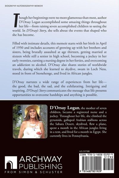 Though her beginnings were no more glamorous than most, author D'Orsay Logan accomplished some amazing things throughout her life-from raising seven accomplished children to seeing the world. In D'Orsay's Story, she tells about the events that shaped who she has become. Filled with intimate details, this memoir starts with her birth in April of 1950 and includes accounts of growing up with her brothers and sisters, being brutally assaulted at age thirteen, getting married at sixteen while still a senior in high school, becoming a jockey in her early twenties, earning a nursing degree in her forties, and overcoming an addiction to alcohol. D'Orsay also shares stories of worldwide travels, during which she learned to skydive, swam in Loch Ness, stood in front of Stonehenge, and lived in African jungles. D'Orsay narrates a wide range of experiences from her life-the good, the bad, the sad, and the exhilarating. Intriguing and inspiring, D'Orsay's Story communicates the message that life presents opportunities to overcome hardships and anything is possible.