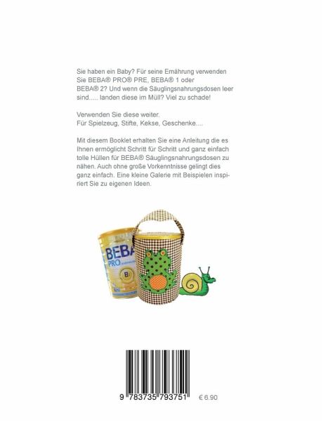 Sie haben ein Baby? Herzlichen Glückwunsch!Für seine Ernährung verwenden Sie NESTLE ® BEBA® Produkte? Und wenn die Säuglingsnahrungsdosen leer sind..... landen diese im Müll? Viel zu schade!Up-Cycling ist angesagt! Verwenden Sie diese weiter. Für Spielzeug, Stifte, Kekse, Geschenke.... Mit diesem Büchlein erhalten Sie eine bebilderte Anleitung wie Sie Schritt für Schritt ganz einfach schöne Hüllen für die Dosen nähen können. Auch ohne große Vorkenntnisse gelingt dies ganz einfach.Eine kleine Galerie mit Beispielen inspiriert Sie zu eigenen Ideen.
