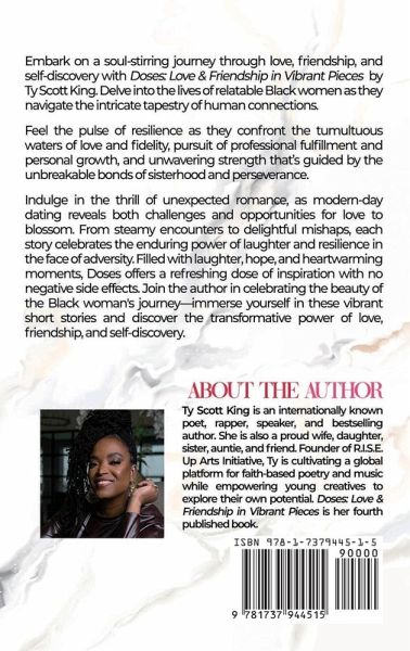 Embark on a soul-stirring journey through love, friendship, and self-discovery with Doses: Love & Friendship in Vibrant Pieces by Ty Scott King. Delve into the lives of relatable women as they navigate the intricate tapestry of human connections. Feel the pulse of resilience as they confront the tumultuous waters of love and fidelity, pursuit of professional fulfillment and personal growth, and unwavering strength that's guided by the unbreakable bonds of sisterhood and perseverance. Indulge in the thrill of unexpected romance, as modern-day dating reveals both challenges and opportunities for love to blossom. From steamy encounters to delightful mishaps, each story celebrates the enduring power of laughter and resilience in the face of adversity. Filled with joy, hope, and heartwarming moments, Doses offers a refreshing dose of inspiration with no negative side effects. Immerse yourself in these vibrant short stories and discover the transformative power of love, friendship, and self-discovery.