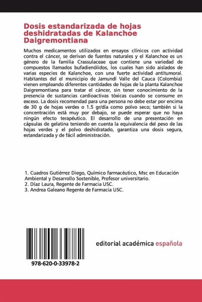 Muchos medicamentos utilizados en ensayos clínicos con actividad contra el cáncer, se derivan de fuentes naturales y el Kalanchoe es un género de la familia Crassulaceae que contiene una variedad de compuestos llamados bufadienólidos, los cuales han sido aislados de varias especies de Kalanchoe, con una fuerte actividad antitumoral. Habitantes del el municipio de Jamundí Valle del Cauca (Colombia) vienen empleando diferentes cantidades de hojas de la planta Kalanchoe Daigremontiana para tratar el cáncer, sin tener conocimiento de la presencia de sustancias cardioactivas tóxicas cuando se consume en exceso. La dosis recomendad para una persona no debe estar por encima de 30 g de hojas verdes o 1.5 gr/día como polvo seco; también si la concentración está muy por debajo, se puede esperar que no haya ningún efecto terapéutico. El desarrollo de una presentación en cápsulas de gelatina teniendo en cuenta la equivalencia del peso de las hojas verdes y el polvo deshidratado, garantiza una dosis segura, estandarizada y de fácil administración.