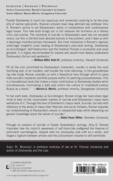 In Dostoevsky as Suicidologist, Amy D. Ronner illustrates how self-homicide in Fyodor Dostoevsky’s fiction prefigures Emile Durkheim’s etiology in Suicide as well as theories of other prominent suicidologists. This book not only fills a lacuna in Dostoevsky scholarship, but provides fresh readings of Dostoevsky’s major works, including Notes from The House of the Dead, Crime and Punishment, The Idiot, Demons, and The Brothers Karamazov. Ronner provides an exegesis of how Dostoevsky’s implicit awareness of fatalistic, altruistic, egoistic, and anomic modes of self-destruction helped shape not only his philosophy, but also his craft as a writer. In this study, Ronner contributes to the field of suicidology by anatomizing both self-destructive behavior and suicidal ideation while offering ways to think about prevention. But most expansively, Ronner tackles the formidable task of forging a ligature between artistic creation and the pluripresent social fact of self-annihilation.