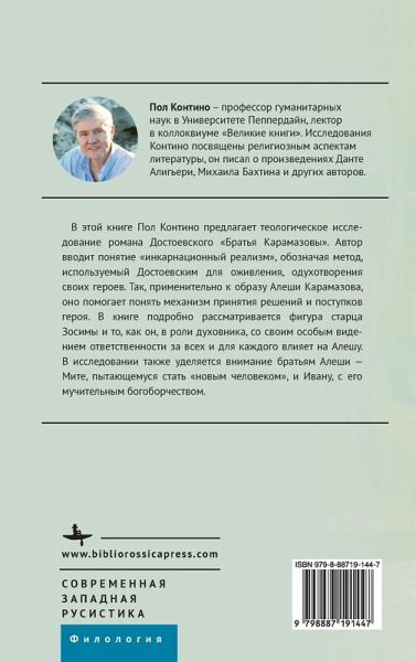 In this book, Paul Contino offers a theological interpretation of Dostoevsky's novel "The Brothers Karamazov." The author introduces the concept of "incarnational realism": a method used by Dostoevsky to animate and enspirit his heroes - applying the concept especially to Alyosha Karamazov, to the person who, as the novel's hero, makes decisions and accomplishes deeds. The book examines in detail the figure of the Elder Zosima, and how, in his role as spiritual leader with his vision of responsibility for each and for all, influences Alyosha. Attention is also paid to Alyosha's brothers - to Mitya, who is trying to become a "new man," and to Ivan, who struggles with his own agonized striving toward his own sense of responsibility for the family tragedy."